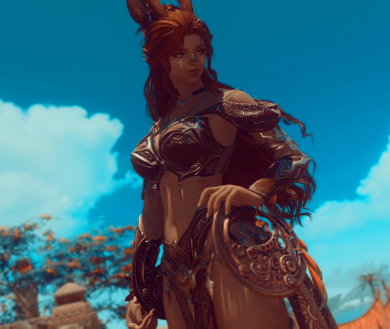 Emi is 5'10 tall and her figure is rather curvy. She wears her wine red hair in tribal braids or open and much to her dismay... her ears turned out to be rather short and fluffly. Her skin is tanned, the tattos on her nose and cheeks are golden and her hazle eyes are the only gentle features in her face.The Rava has no problems with revealing much of her sunkissed skin. In fact it is easier to move and some people are treating you much more friendly. She prefers flowy fabrics, which are light and won't weight her down.