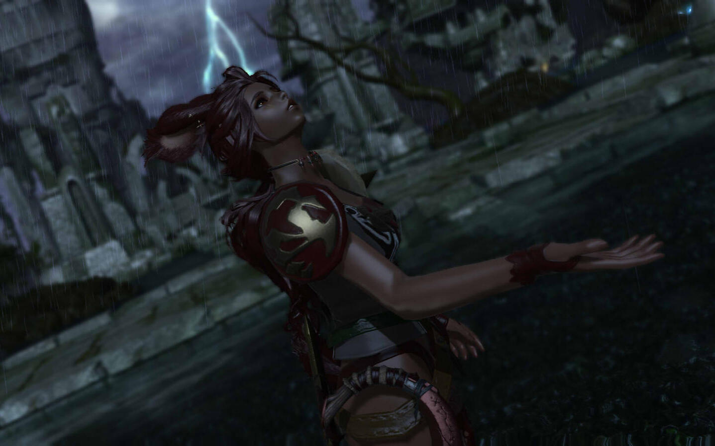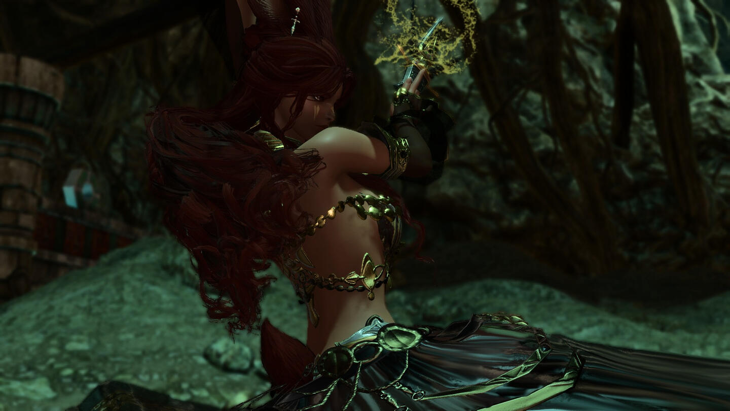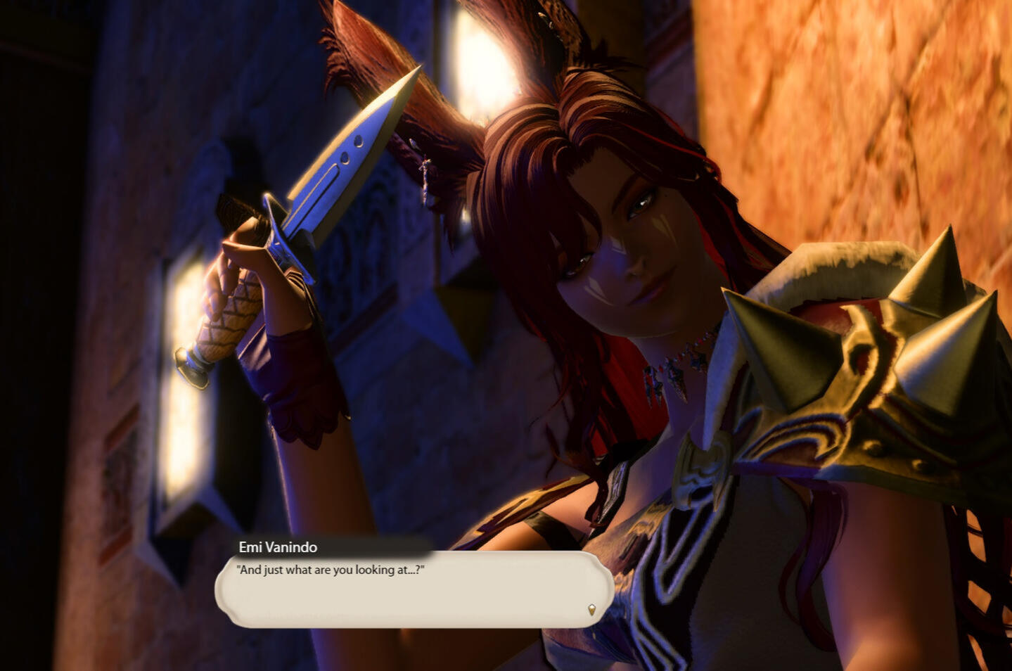 Emi is a secretive and well observing Rava. She thinks quickly before she speaks, can take on many roles and is not trusting people easily.The harsh years of traveling had taught her how cold this world is and that any race, be it the biggest Hrothgar or the tinest Lala, can be evil.If you gain her trust though, she has a very decent sense of humor, is very loyal, protective and not as stern as she seems.Truth is, she is secrety, very secretly a big fan of cute things, kitsch and is unable to deal with any sort of plant. Very unlikely for a child of the forest and she is highly embarrassed about it.